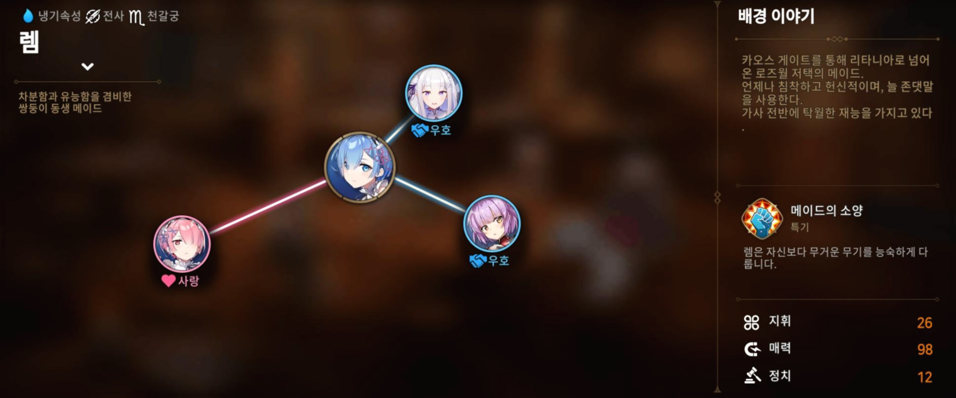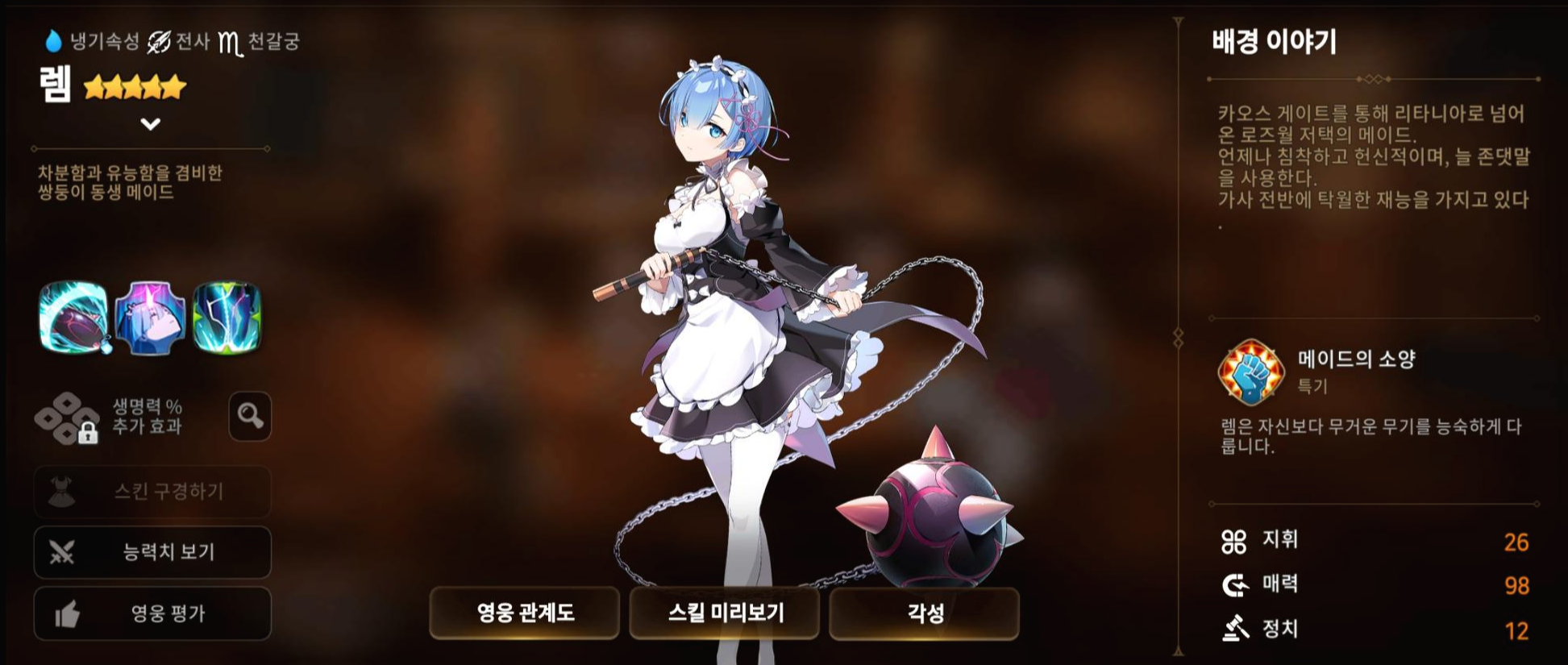 이번 '리제로' 콜라보로 나온 영웅 '렘'은 보시는 것처럼 '냉기'속성의 '전사'로 출시된 영웅입니다.
