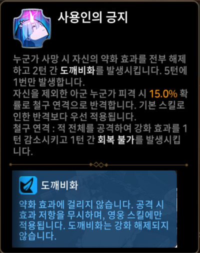 그리고 자신을 제외한 아군이 피격 시 기본적으로 15%, 스킬강화시 최대 20% 확률로